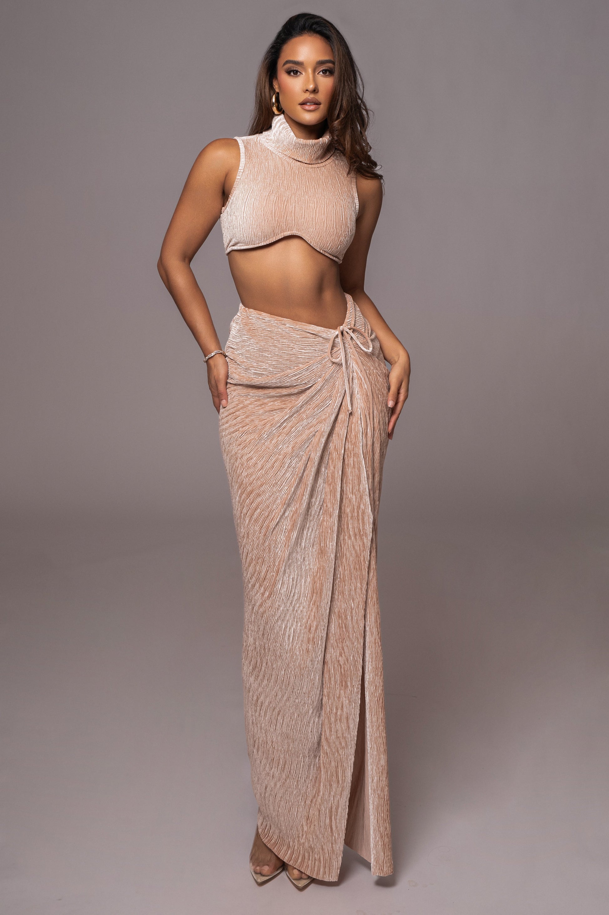 Our Beige Chosen One Velvet Skirt Set makes styling your next night out effortless! Crinkled velvet fabric shapes this romantic two-piece set featuring a sleeveless crop top with a turtleneck and an under-bust cut with structured wiring. The matching skirt is cut with a high waist and details a beautiful drape and side slit. Single-lined with stretch. Sold as set.