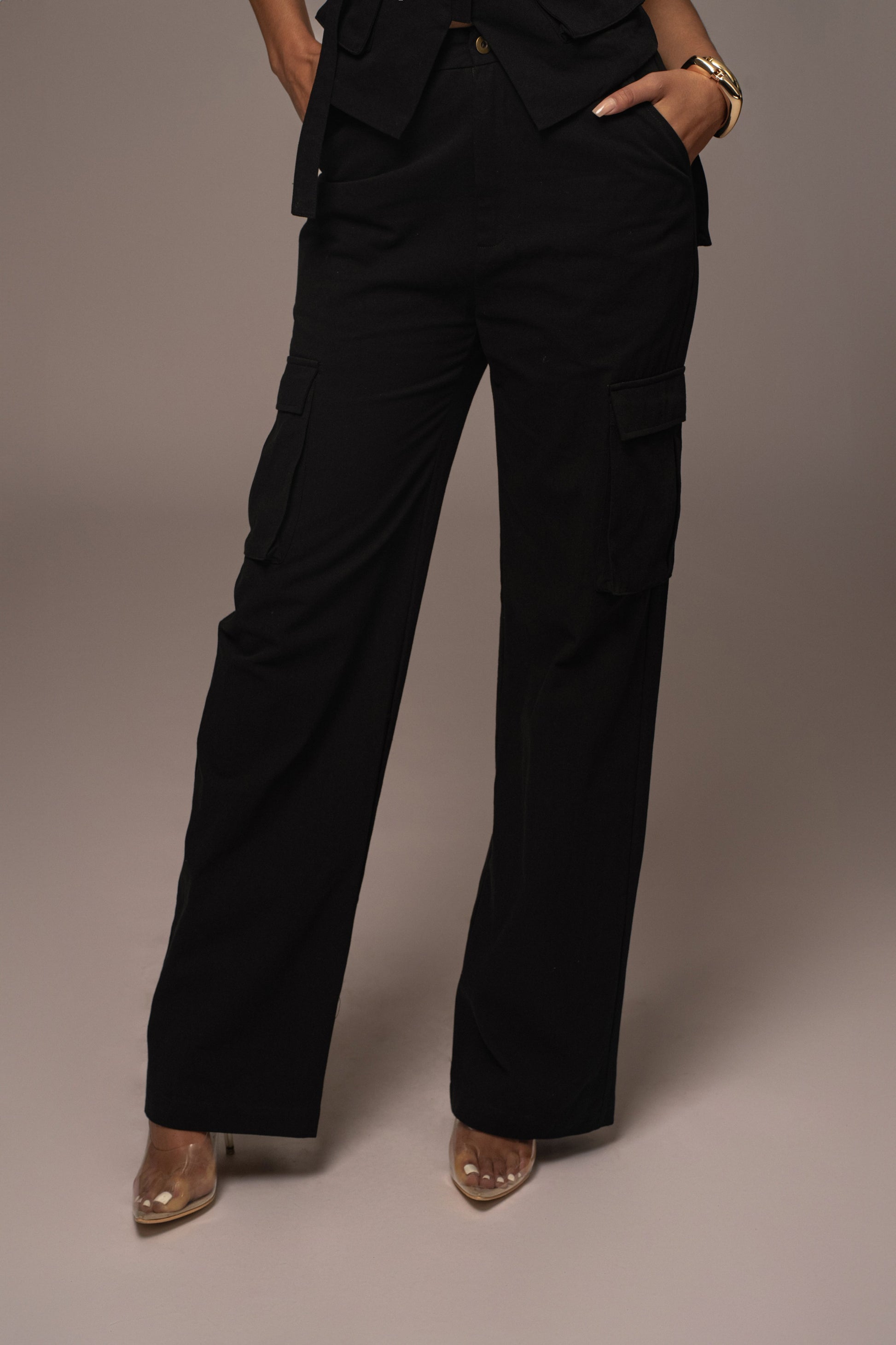 Our Black Aeris Pant Set is a match made in heaven. This vacation ready pant set features a halter top with stylish cargo pockets and front zipper closure. The matching pants feature straight leg hems with front button/zipper closure, functional side/back pockets, and cargo pockets for added functionality and style. Elastic waistband. No stretch. Sold as set. Top is double-lined, Pants are single-lined.