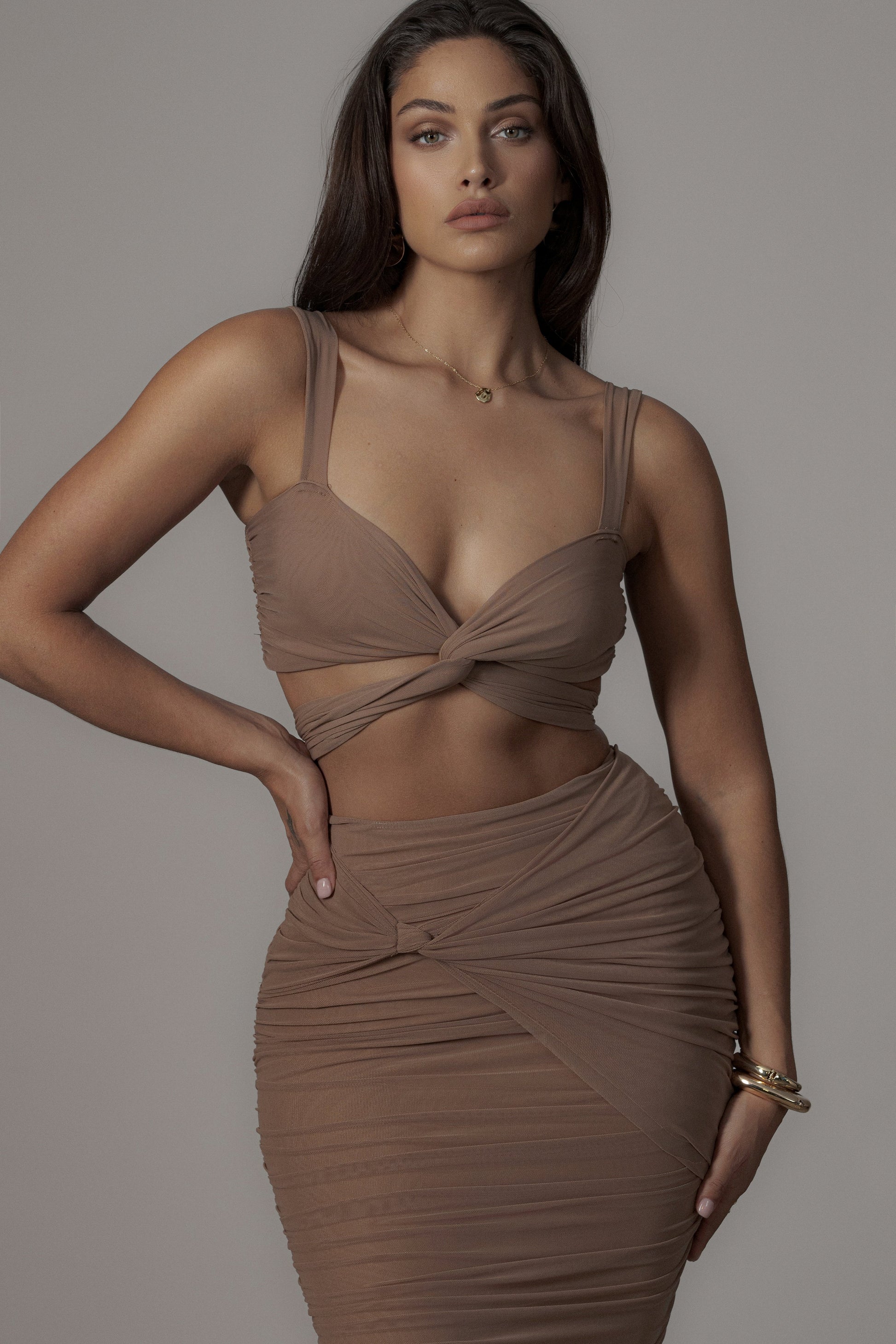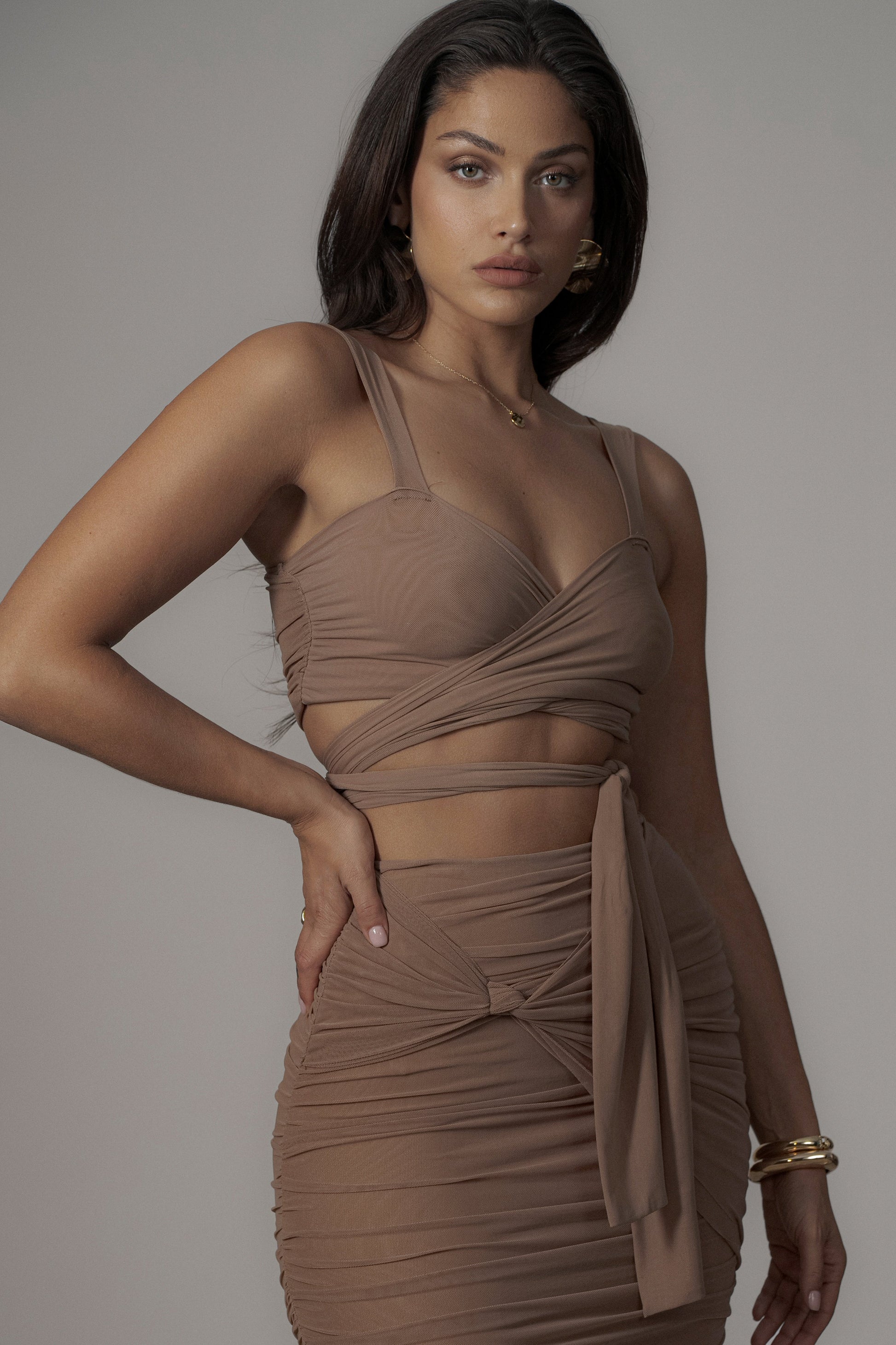 Turn heads this summer with our Pecan Extend Your Stay Skirt Set. Made with power mesh fabric, this stylish skirt set includes a multi-way crop top with front ties and shoulder straps. The matching skirt is fitted and has a stylish front knot detail. Ruching throughout the design adds texture and visual appeal. Double lined. Stretchy. Sold as set.
