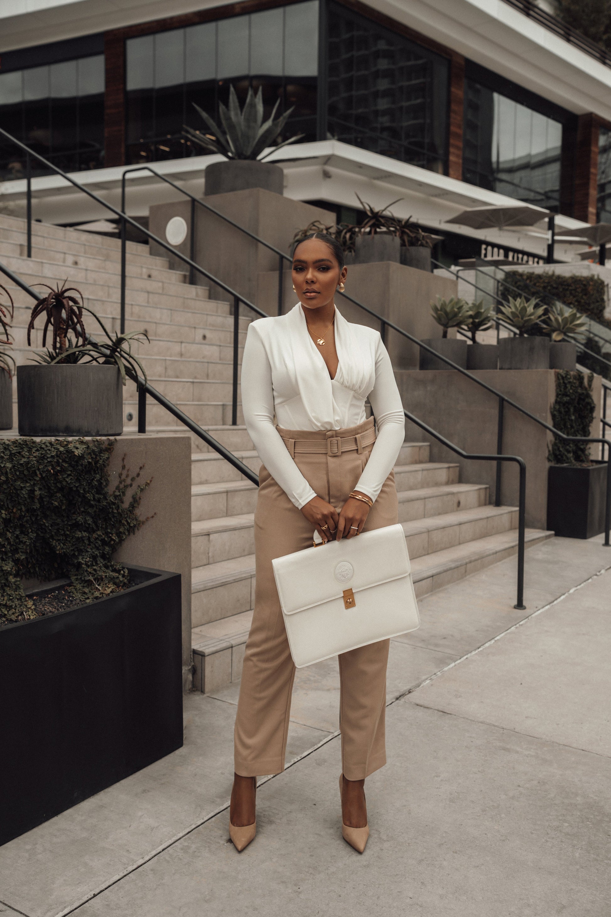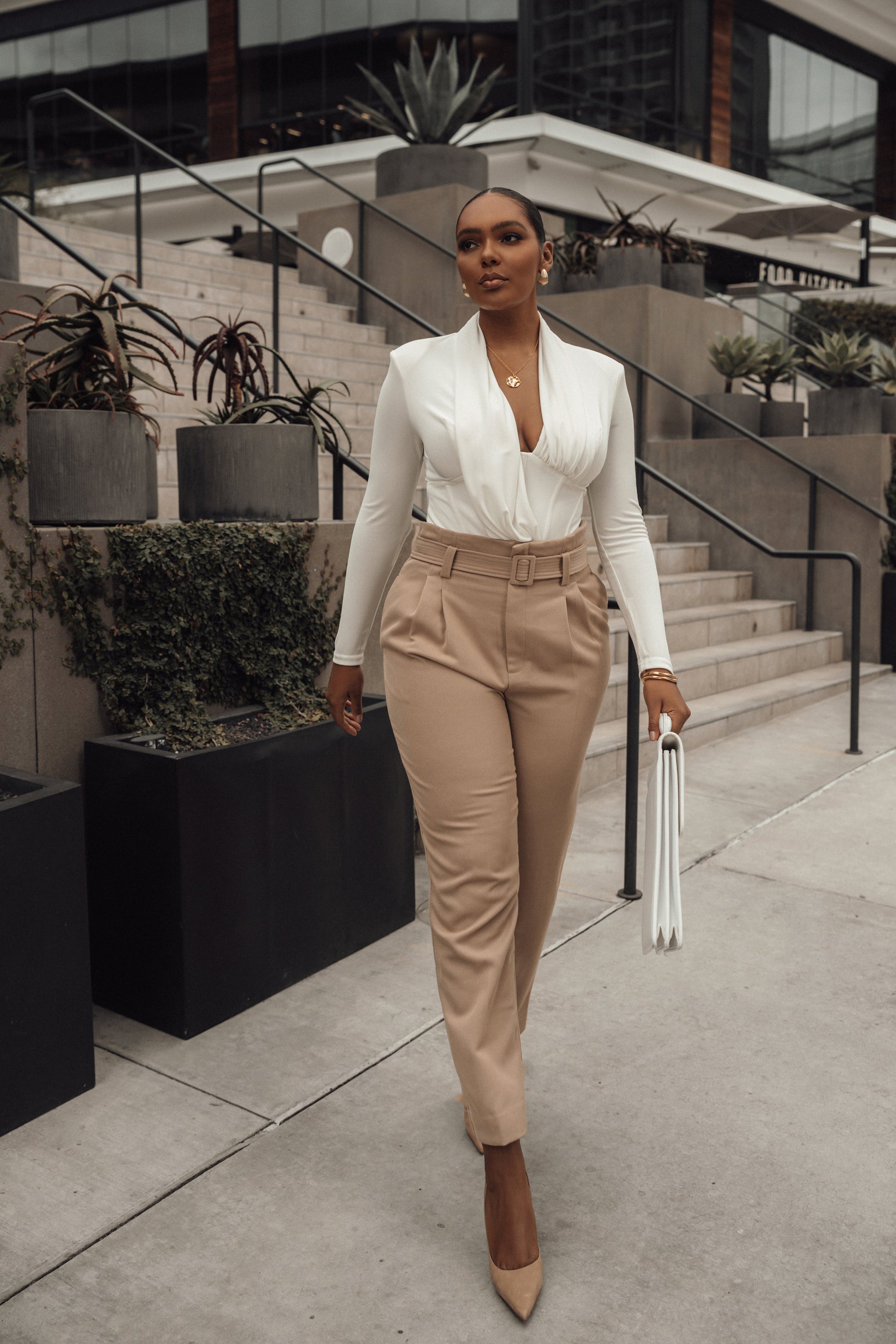 Our White Drape Corset Bodysuit is luxurious to the touch. Featuring boning for structure with a low neckline, modern drape design, and back zipper closure. Long sleeve arms with padded shoulders add further sophistication. The lower waist of this bodysuit is made of doubled-lined fabric for extra comfort. Pair with our Revival Belted High Waist Pants for the full look. Stretchy. Single lined.