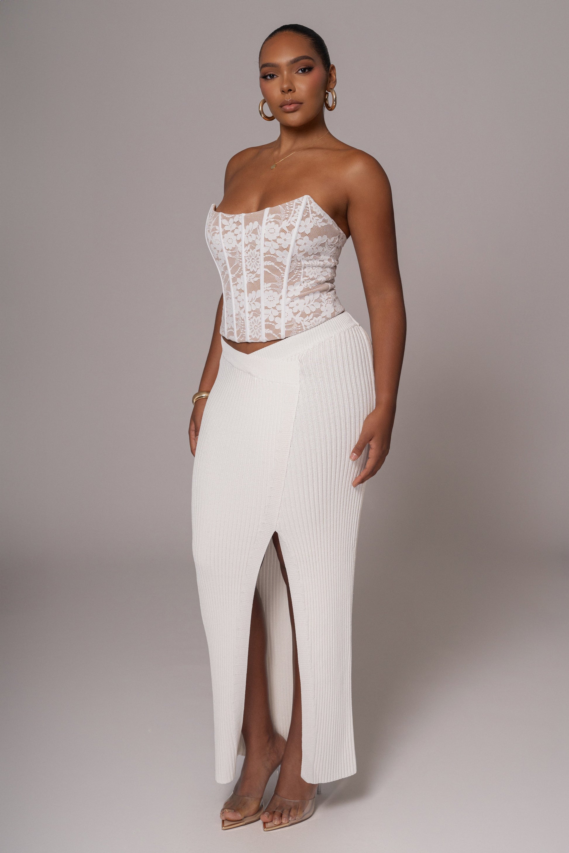 Find the perfect balance of femininity and style with our White Rosemere Lace Top. This exquisite lace corset, expertly crafted with boning for added structure, is designed with nude interior lining for coverage and comfort. Complete with grip silicone gel at the chest for a secure hold and a back zipper closure in gold-tone finish. Medium stretch.