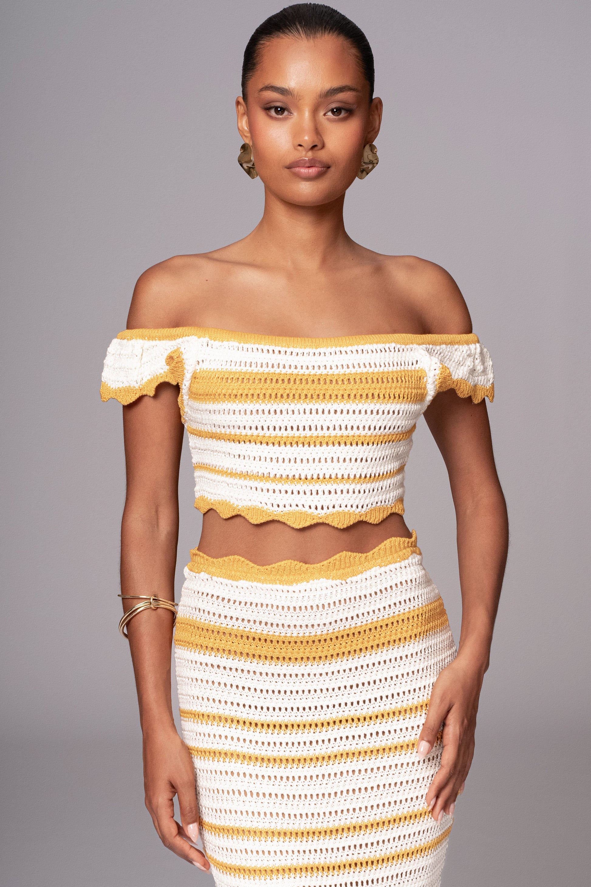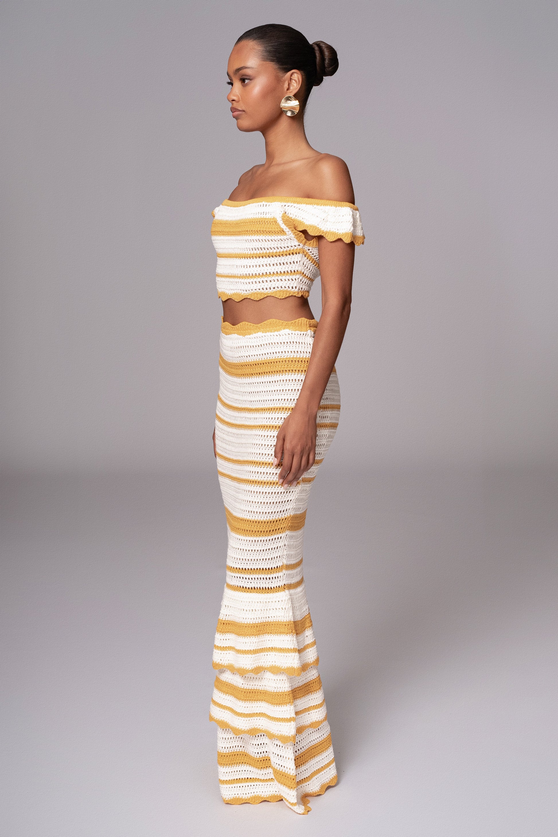 Indulge in luxury with our Yellow Corazon Ruffle Skirt Set. Crafted from a crochet knit fabric, this two-piece skirt set features an elegant striped design in shades of ivory and yellow. The crop top comes with scalloped trim shoulder straps that can be styled an off the shoulder. The matching skirt features an elastic waistband and ruffle tiers with scalloped trims for a finishing touch. Sold as set.